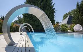 Su altı ve su üstü mimarisinde kavisli paslanmaz çelik yapılar, suyun tahliye prensiplerini estetik bir disiplinle buluşturur. 60 cm genişlik ve 90 cm yükseklik parametrelerine sahip kobra formundaki üniteler, suyun havuz yüzeyine düşüş ivmesini yerçekimiyle optimize eden birer hidrodinamik araçtır. Bu ölçekteki yapılar, suyun statik duruşunu bozarak dikey bir akış kanalı oluşturur.